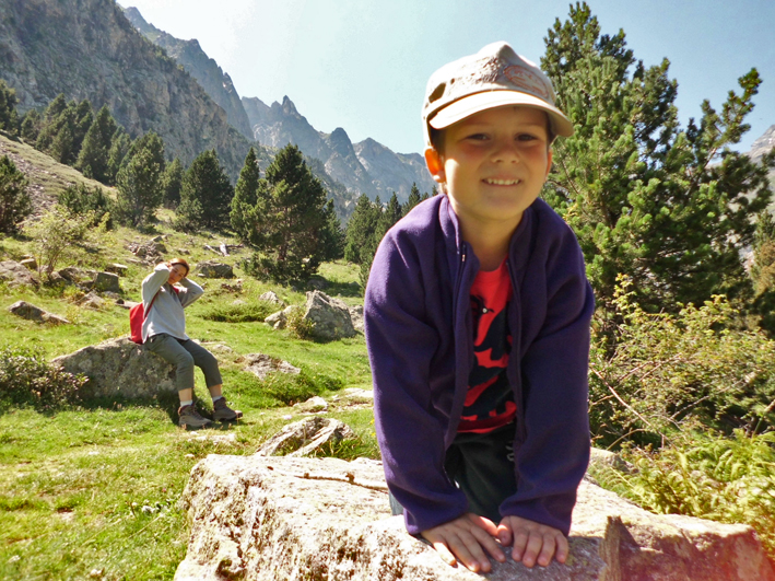 Y ahí me tenéis, avanzando agazapado, procurando no hacer ruido, intentando quedar fuera de su campo de visión… Y cuando me giro, ahí está Albert, retozando cual sarrio tras mis pasos. “Papa, ¿qué haces?” “Chssssst… que se van a ir”. Finalmente, parapetado tras una roca, y después de convencer a mi hijo de que espere sentado unos metros más abajo, consigo hacer las fotos (lástima no tener un buen objetivo). Cuando me giro para recoger al peque y volver con mamá, él ya marcha ladera abajo, con unos andares de lo más despreocupados… Hay qué ver cómo son los niños. No dejas de sorprenderte por su capacidad de aprender, de desarrollar habilidades que creías todavía fuera de su alcance. En una situación así la razón te dice que tienes que reñirle por no hacerte caso en un lugar que podría resultar peligroso… pero no puedes evitar que se te escape una sonrisa, mezcla de admirada sorpresa y de orgullo por ver que el pequeñajo ya hace las cosas que tú hacías a una edad que recuerdas mucho menos precoz.