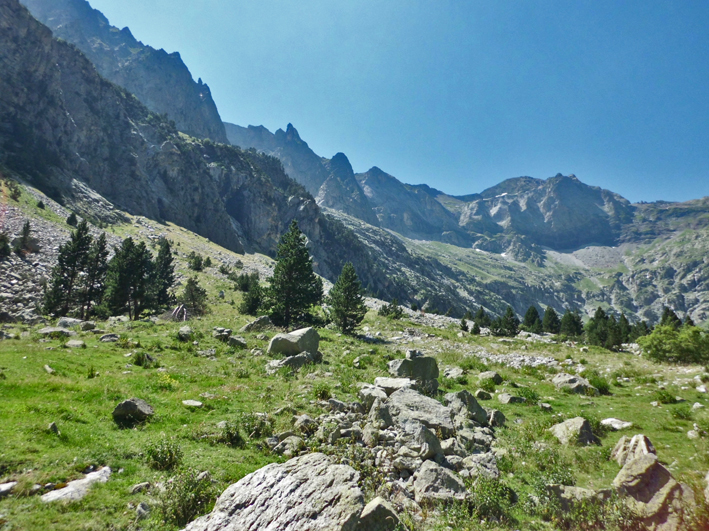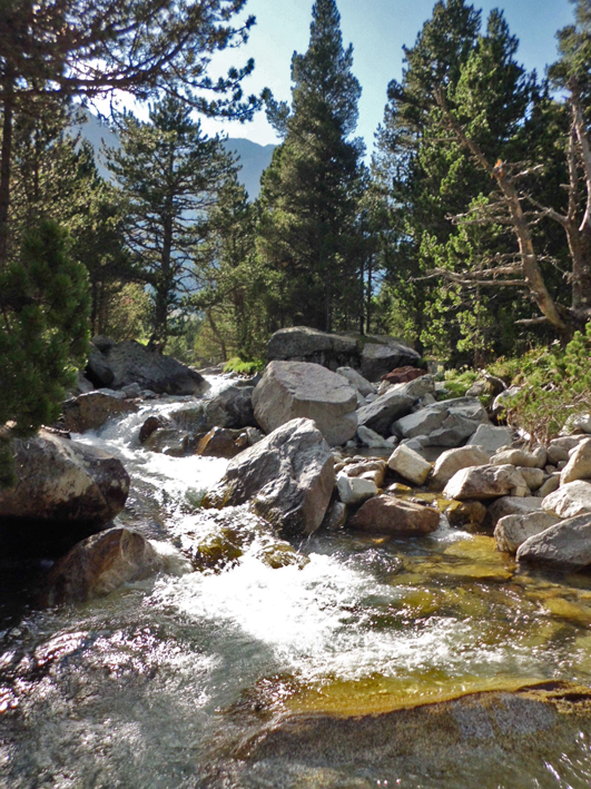 Pronto la pendiente se suaviza y el camino se va estrechando a medida que se acerca al saltarín río Barrosa y sus aguas color esmeralda, que ya no perderemos de vista a nuestra derecha, y empiezan a aparecer al fondo las moles calcáreas que rodean el valle, entre las que sobresale el pico de la Munia (3.133 m.).