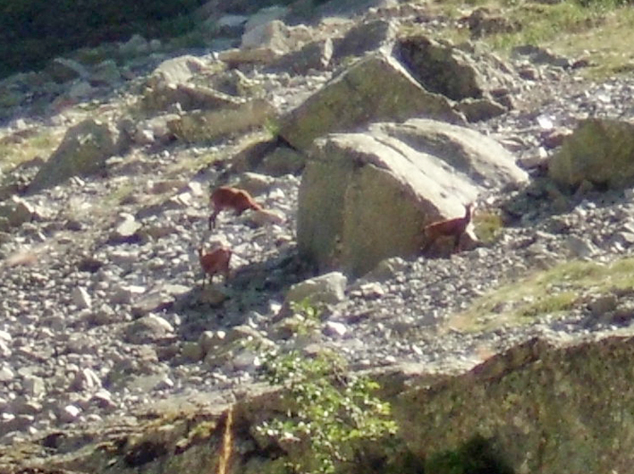Nos sentamos a comer en la hierba mientras nos maravillábamos con el paisaje, paseando la mirada por doquier, disfrutando de la calma y del silencio, y a eso que mirando ladera arriba me encuentro con una figura que no puede ser otra cosa que un sarrio/rebeco, el escurridizo y desconfiado rey de estas montañas. Efectivamente, se trata de una familia de sarrios que ha bajado en busca de pastos verdes. Contamos hasta cinco ejemplares, a unos 200 metros de distancia. Nos observan con precaución, pero no huyen. No deben considerarnos un peligro inminente. Tras unos minutos de observación mutua decido acercarme montaña arriba, a ver si puedo hacerles algunas fotos en las que se aprecie que, efectivamente, son animales y no unas inclasificables manchas oscuras.